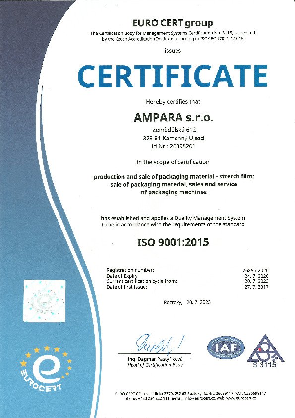 AMPARA s.r.o., byla založena roku 2005 jako nástupnická společnost podnikající fyzické osoby, Pavla Žemličky. Během několika let se AMPARA stala silnou a stabilní společností, která nyní patří mezi největší dodavatele obalových materiálů v České republice a svou činností úspěšně proniká i na zahraniční trh. Jsme držitelem certifikace ISO 9001:2016.